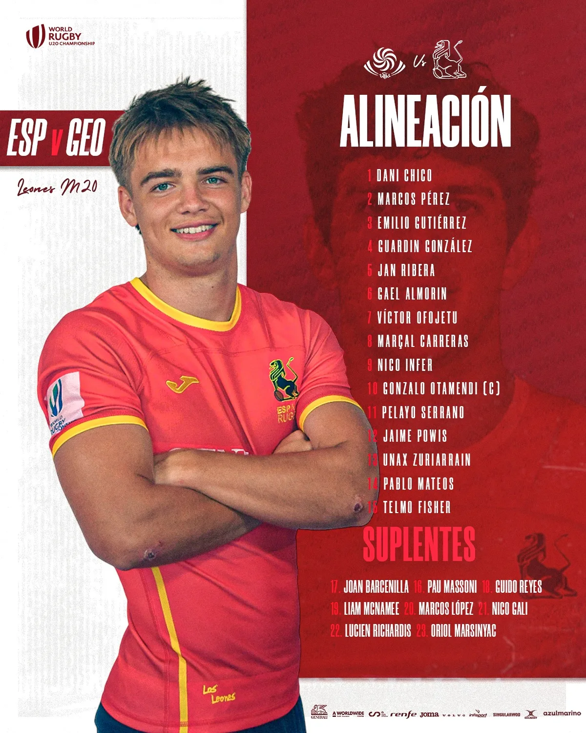 El Seleccionador Nacional M20, Ricardo Martinena, revoluciona su XV inicial al introducir 12 cambios en el primer partido de España en la fase final del Mundial de la categoría que se está disputando en Italia. Los Leones M20, que se quedaron a las puertas de la victoria ante Argentina tras una excelsa primera mitad y obligaron a Gales a emplearse a fondo para llevarse la victoria, se enfrentarán a Georgia el lunes a las 15:30, hora española peninsular, en el Payanini Center de Verona.
