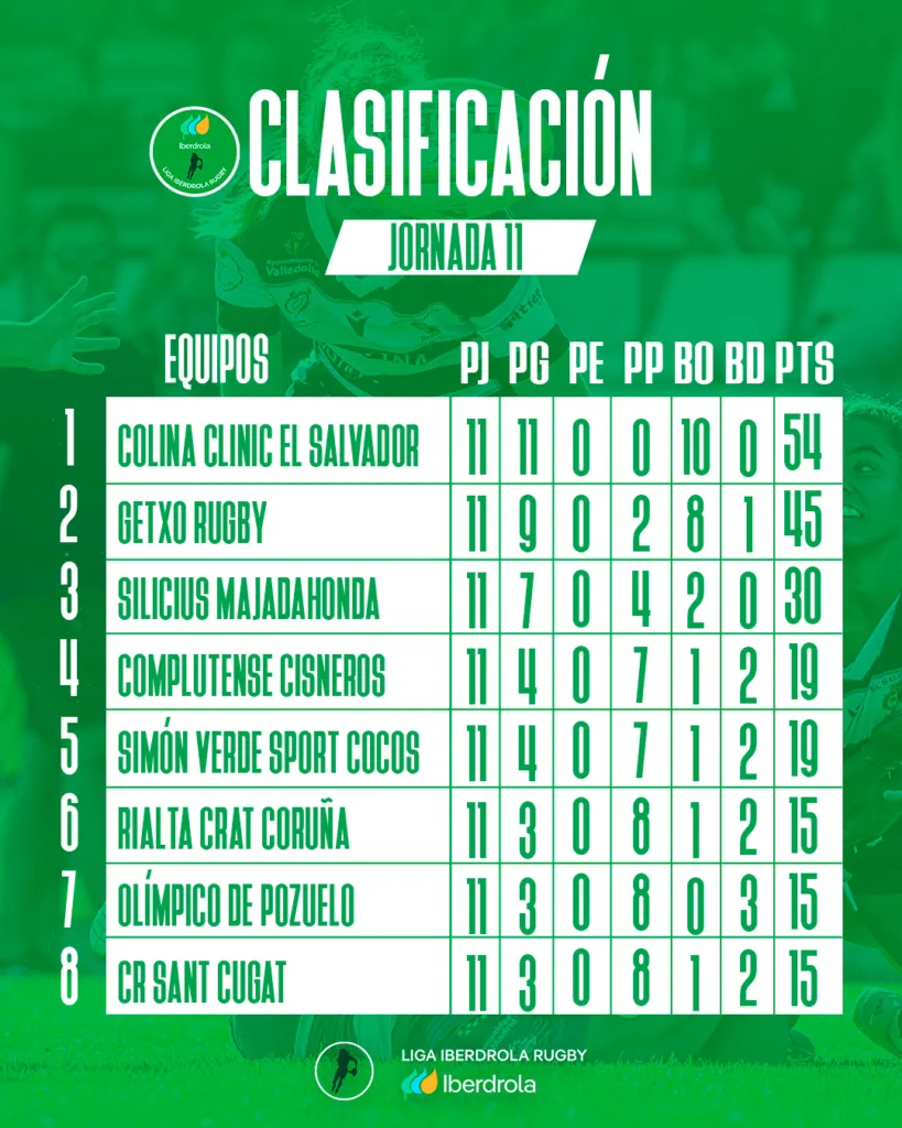 En paralelo, Getxo Rugby no cedió terreno en la pelea por el liderato y se impuso por 34-12 al Rialta CRAT Coruña, manteniendo la segunda posición con 45 puntos. El equipo vasco supo gestionar los momentos clave del partido, castigó los errores rivales y volvió a evidenciar su regularidad en un tramo de la temporada en el que cada punto empieza a ser determinante. De este modo, el conjunto vizcaíno continúa la estela del líder y consolida su candidatura a disputar las posiciones de privilegio hasta el final.