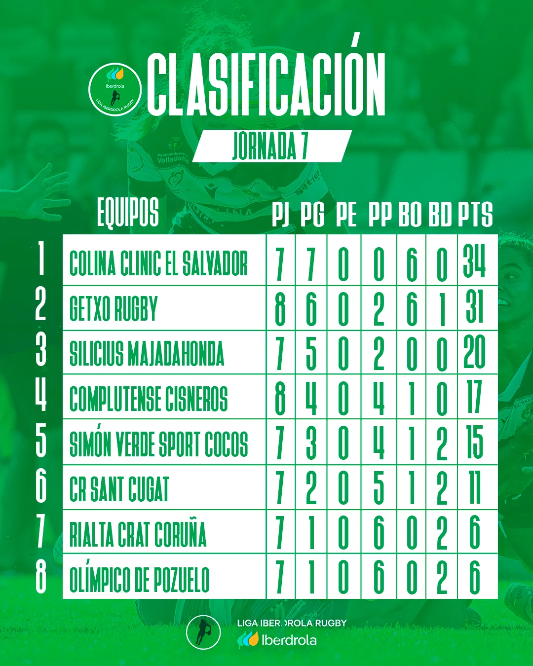 Tras estos resultados, El Salvador encabeza la clasificación con 34 puntos, seguido por Getxo Rugby con 31. Silicius Majadahonda ocupa la tercera posición con 20 puntos, mientras que Complutense Cisneros asciende hasta la cuarta plaza. En la parte baja, Rialta CRAT Coruña y Olímpico de Pozuelo continúan cerrando la tabla con seis puntos cada uno.