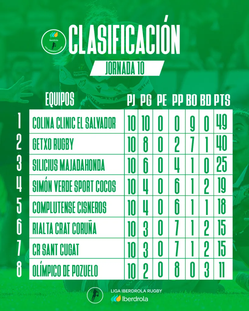 Tras estos resultados, Colina Clinic El Salvador continúa liderando la Liga Iberdrola con autoridad, seguido por Getxo Rugby y Silicius Majadahonda. La zona media se comprime, con Cocos Sevilla, Cisneros, CRAT Coruña y Sant Cugat separados por pocos puntos, mientras que Olímpico de Pozuelo sigue cerrando la clasificación pese a su esfuerzo competitivo.