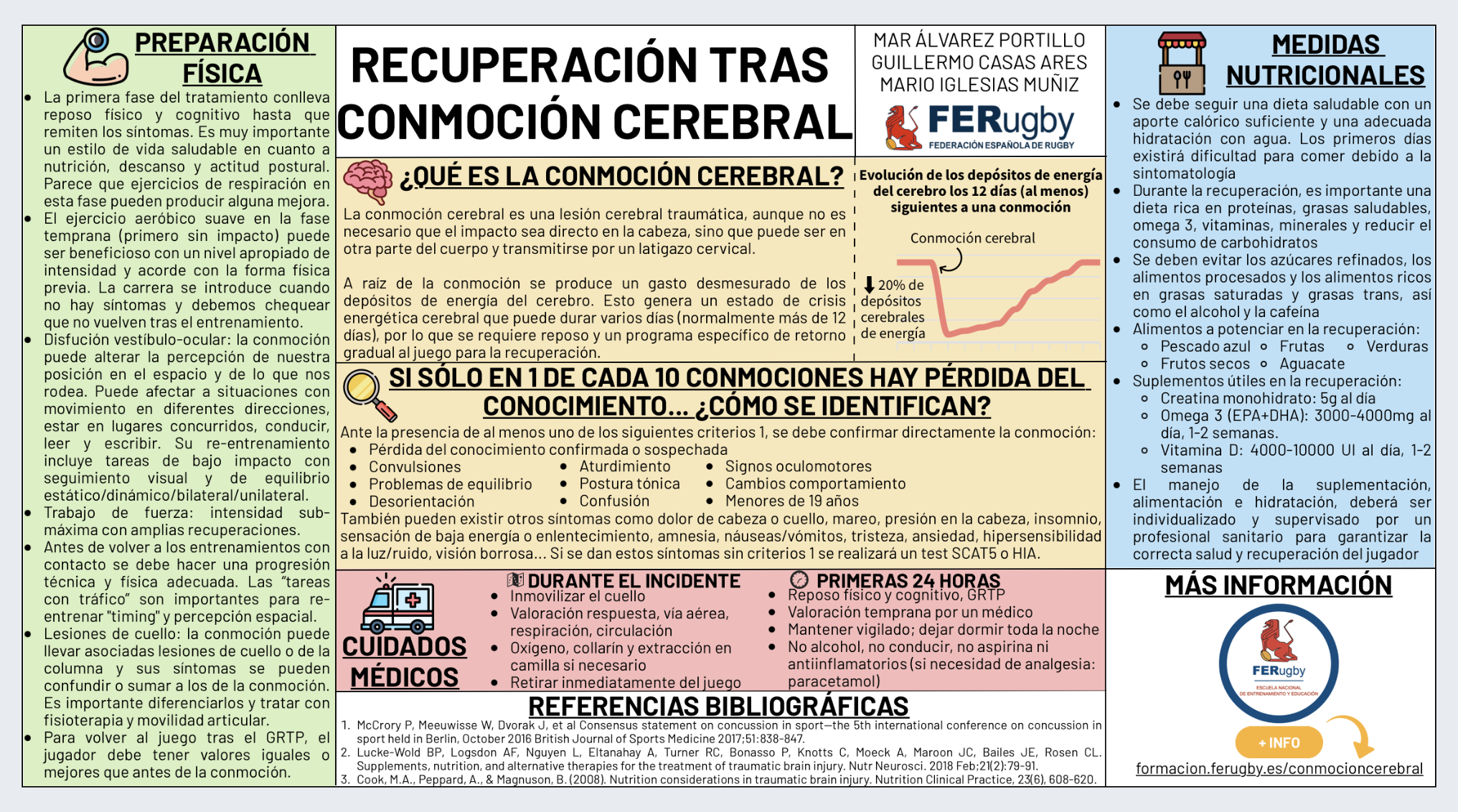 Estamos trabajando al amparo de WORLD RUGBY, organismo que desarrolla y controla el protocolo de actuación de primeros auxilios en el campo de rugby. Y queremos trabajar con las Federaciones Autonómicas y los Clubes para educar a los jóvenes jugadores para evitar situaciones que pueden llevar a una conmoción, en reconocerlas y aceptar los pasos que se deben seguir tras haber sufrido una.