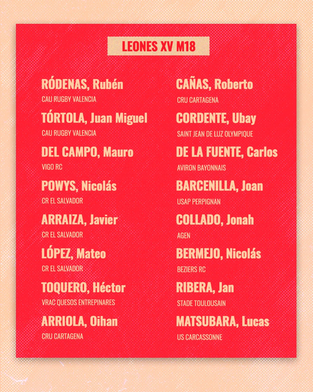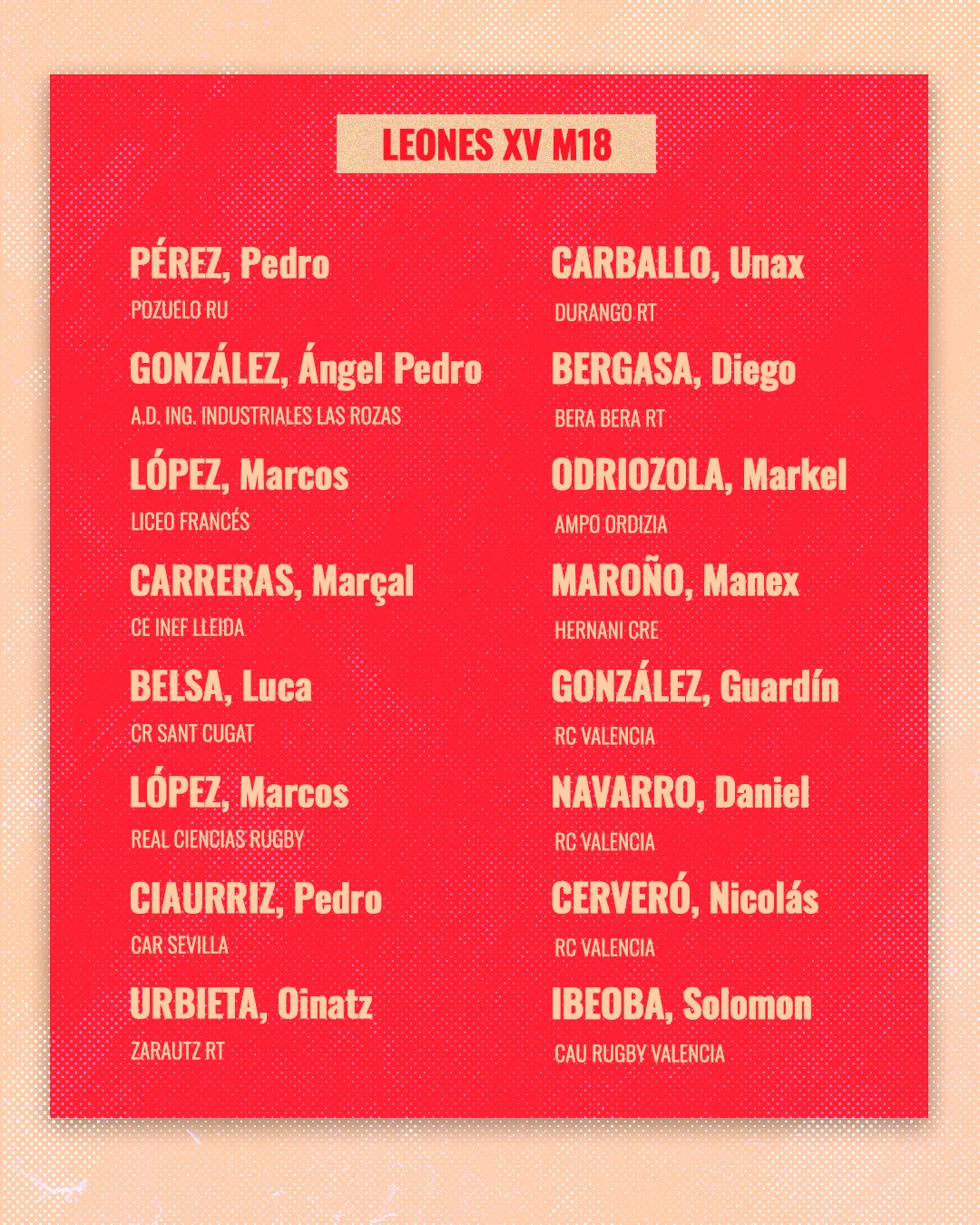 La Selección Española masculina de rugby XV en categoría M18 se concentra del 26 al 30 de junio en Valladolid con el objetivo de, según las palabras del propio Seleccionador Miguel Ángel Puerta «de seguir avanzando en la construcción del equipo, evaluar jugadores e implementar el sistema de juego, de cara al europeo M18 de noviembre». Como ya viene siendo habitual en estas fechas, los jóvenes Leones tendrán además un impacto competitivo enfrentándose el domingo a las 11:00 en los campos de Arroyo de la Encomienda al combinado estadounidense Eagles Impact Rugby Academy ( EIRA ).