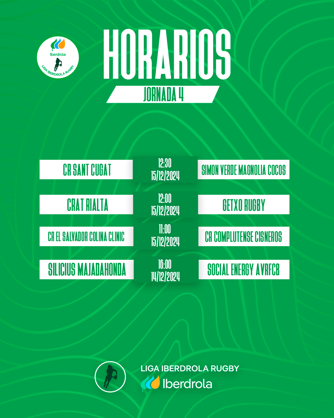 Las vigentes campeonas de la competición, el Silicius Rugby Majadahonda, abrirán la jornada en el Valle del Arcipreste el sábado 14 a las 16:00pm frente al Social Energy AVRFCB, en un encuentro en el que las madrileñas, en caso de ganar, ocuparían la primera posición de La Liga Iberdrola Rugby de forma provisional hasta que las vallisoletanas disputen su encuentro de la cuarta jornada. El streaming del encuentro podrá verse en directo en el Youtube de las madrileñas.