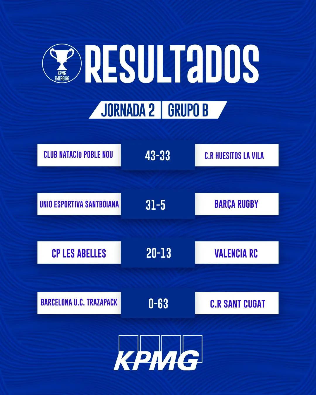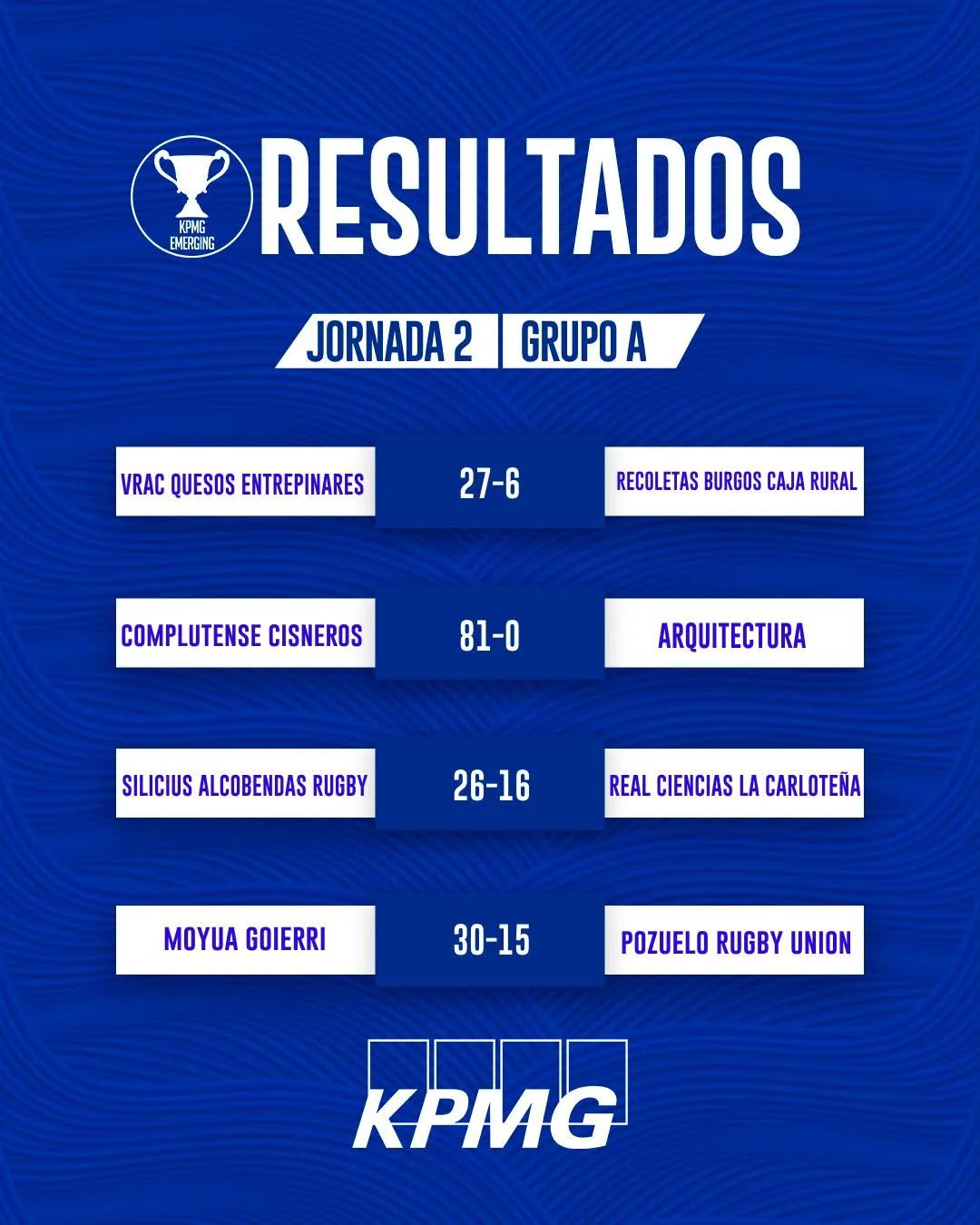 Con sólo dos jornadas disputadas, los favoritos de la Liga KPMG Emerging comienzan a esbozarse, y sólo son seis los equipos que hasta el momento cuentan sus partidos por victorias. Complutense Cisneros, los defensores del título, siguen con paso firme en la cúspide del Grupo A, en el que tampoco han conocido la derrota VRAC Quesos Entrepinares, Silicius Alcobendas y El Salvador. Mientras, en el Grupo B a pesar de que Valencia RC ostente el liderato, son CAU RC y Sant Cugat los que todavía no han conseguido ser batidos por sus rivales.