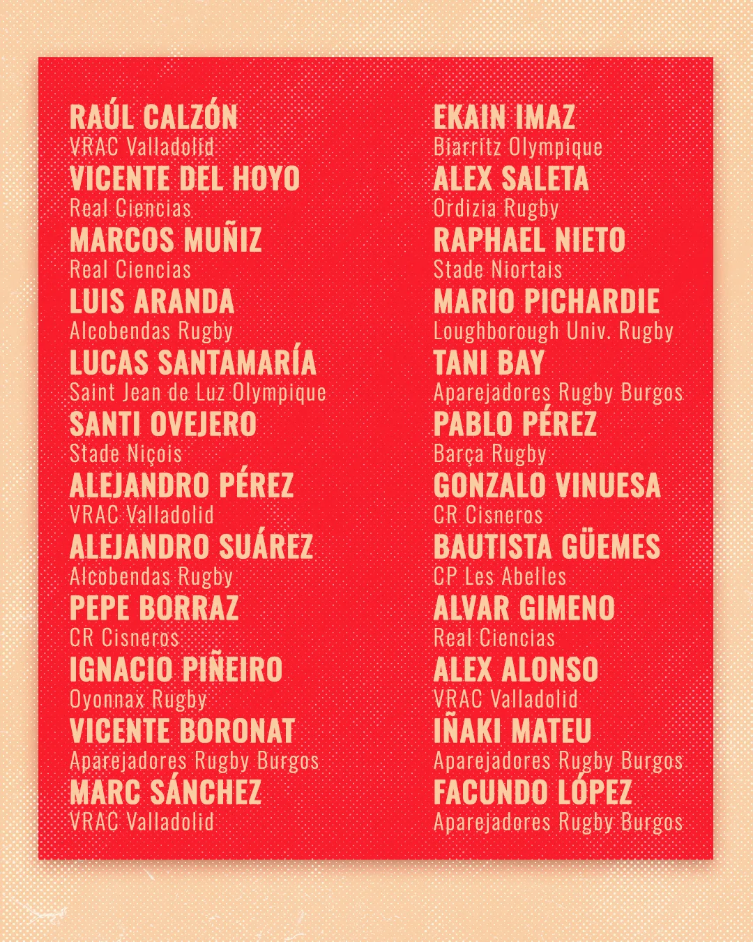 La lista cuenta con muchos de los fijos, como el capitán Mario Pichardie. Vuelve tras lesión Gonzalo Vinuesa y trabajarán también los debutantes Luis Aranda, Vicente Boronat, Pablo Pérez y Facundo López.
