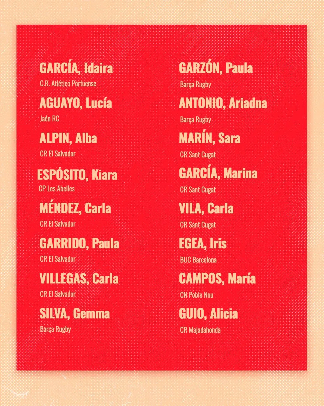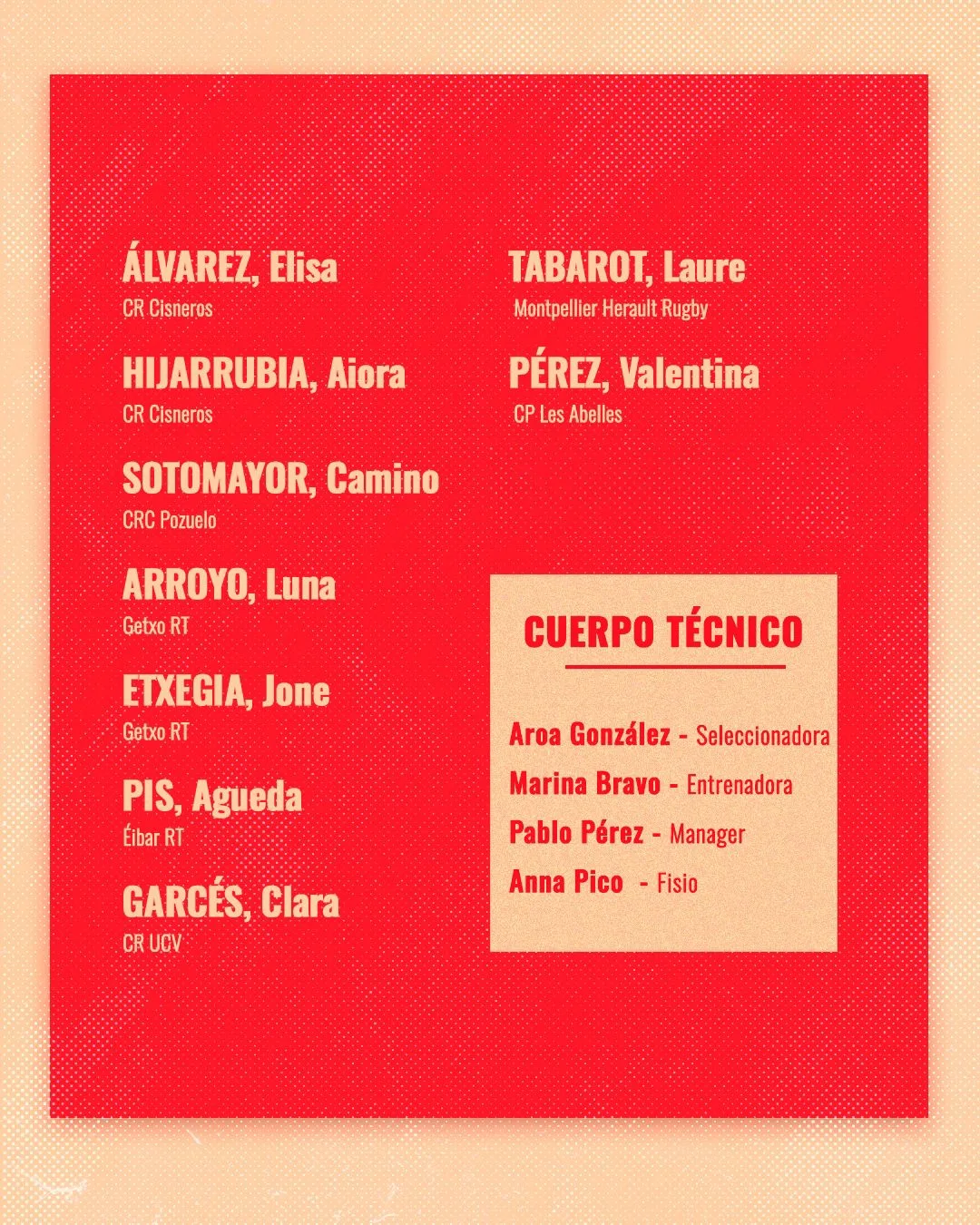 La lista de jugadoras elegidas para el choque por los entrenadores del combinado de Estrellas Iberdrola, Xabier Rodríguez, Head Coach de Silicius Majadahonda, y Ángela Del Pan, entrenadora de Sant Cugat, con la coordinación de la Dirección de Rugby de la Real Federación Española de Rugby es la siguiente: