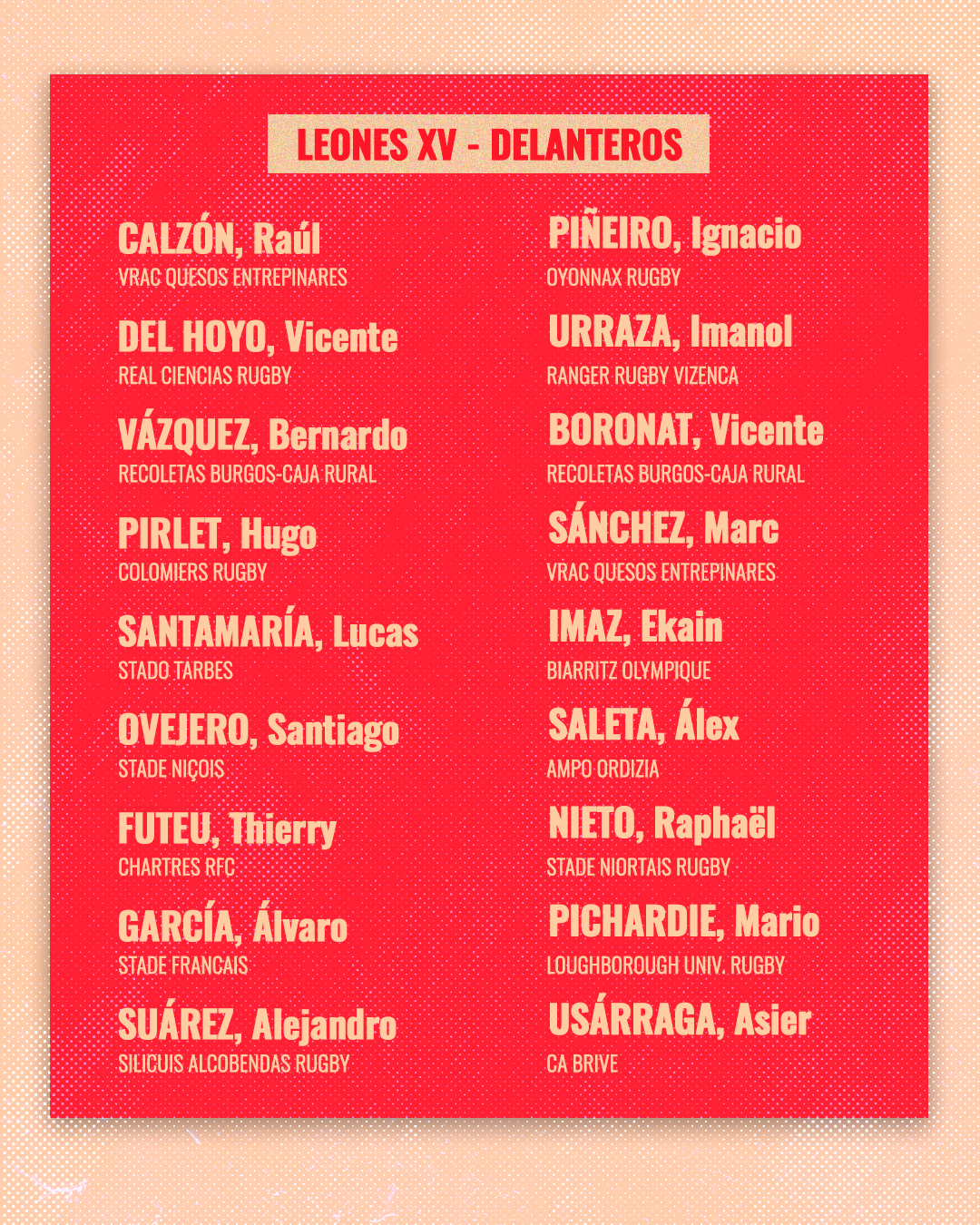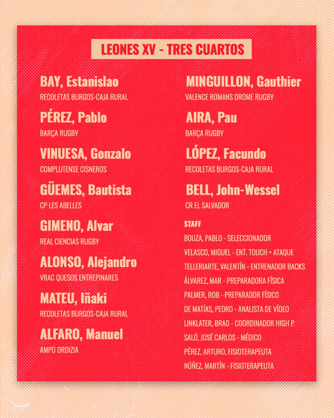 Pablo Bouza y su staff han hecho pública la lista de 30 jugadores que se concentrarán a partir del 30 de junio en Barcelona para desde allí poner rumbo a su primera gira internacional en Oceanía en la que se enfrentarán a Samoa, el sábado 13 de julio en el Apia Park arbitrado por Ben O’Keeffe, y Tonga, el viernes 19 de julio en el Reufaiva Stadium de Nuku’alofa, arbitrado por Pierre Brousset.