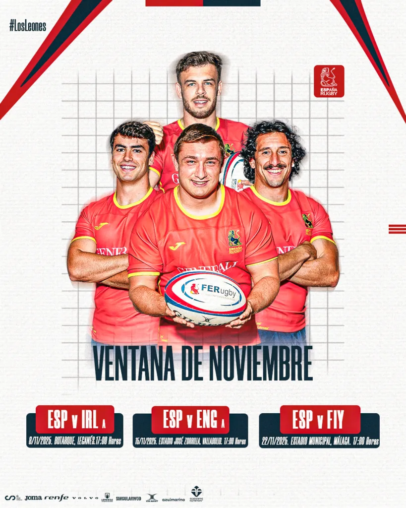 La Selección Española de Rugby XV hace pública la agenda de su ventana internacional de noviembre, que se perfila como una de las más ambiciosas de su historia. Los Leones se medirán a tres potencias mundiales, Irlanda A, Inglaterra A y Fiyi en una serie de compromisos de alto nivel que pondrán a prueba la preparación del combinado nacional en estadios de primer nivel.
