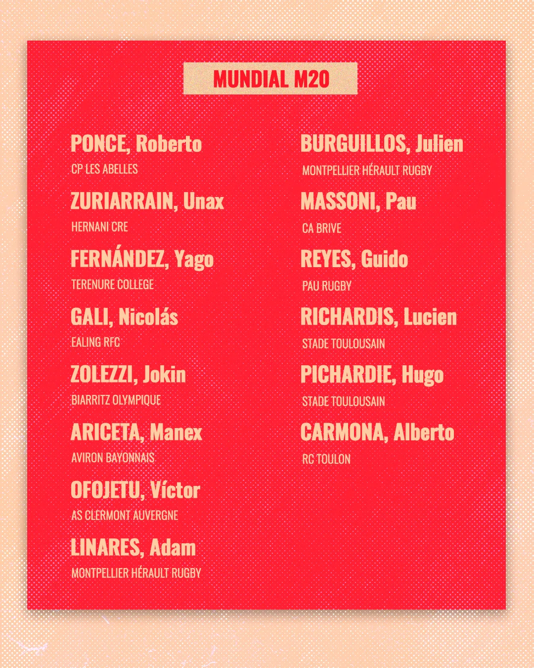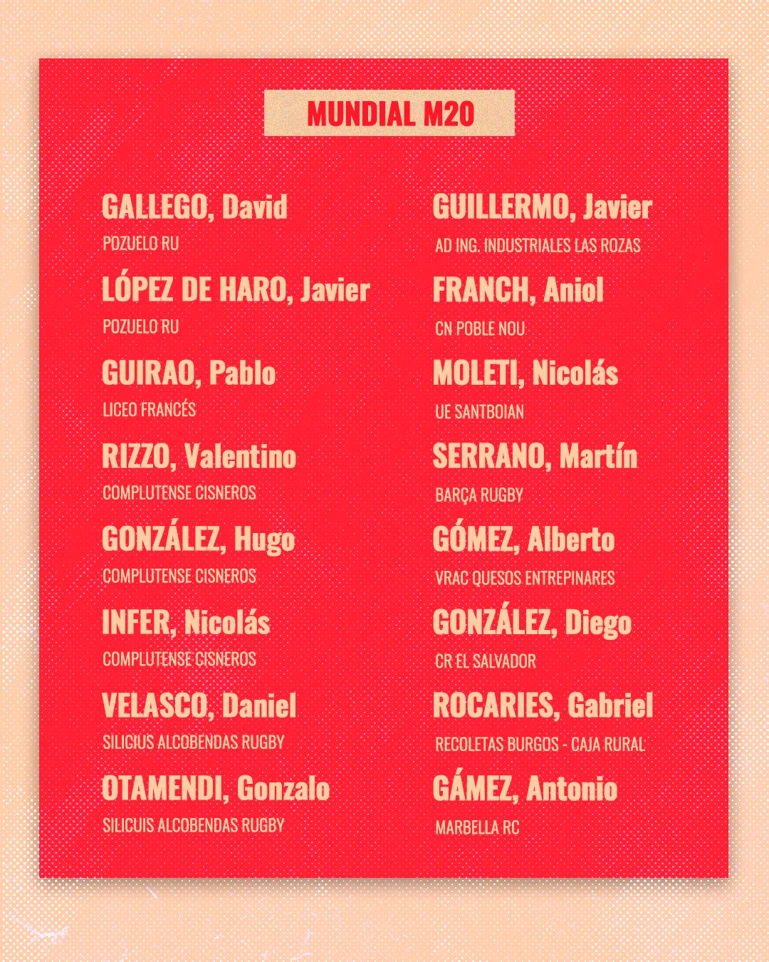 A sólo 18 días de que la Selección Española de Rugby XV M20 participe por primera vez en el Mundial de la categoría entre los 12 mejores equipos del momento, Ricardo Martinena ha hecho pública la lista de 30 jugadores que defenderán la elástica nacional en la esperada cita. Esta será la XIV edición del Campeonato del Mundo de Rugby M20 y se disputará entre el 29 de junio y el 19 de julio de 2024 en Western Cape, Sudáfrica.
