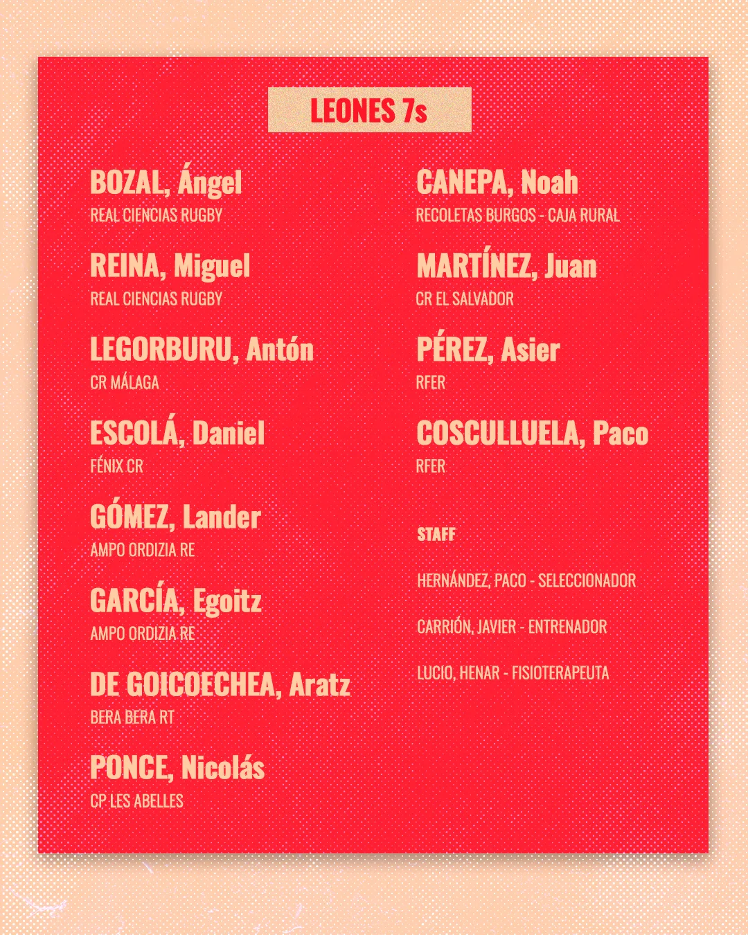 Los Leones7s han quedado encuadrados para la ocasión en el grupo C junto con Georgia, Alemania y Lituania. Paco Hernández y su staff ha decidido mantener a la mitad de la plantilla respecto a la primera serie. Repiten convocatoria Ángel Bozal, Daniel Escolá, Lander Gómez, Egoitz García, Aratz De Goicoechea y Noah Canepa y se incorpora Nicolás Ponce, además de algunos de los habituales en el grupo que disputa las Series Mundiales como Antón Legorburu, Juan Martínez, Asier Pérez o Paco Cosculluela.