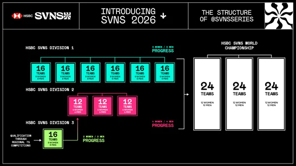 Explicación del gráfico presente en el comunicado de World Rugby: Los ocho equipos que compiten en el HSBC SVNS World Championship 2025 en Los Ángeles (3 y 4 de mayo) serán los equipos de la División 1 del HSBC SVNS para la Serie 2026. Los equipos que finalicen entre el noveno y doceavo puesto en el Playoff de Los Ángeles se clasificarán para el SVNS 2 en la temporada 2025/26. Los equipos que finalicen entre el los puestos 13 y 16 en el ranking, comenzarán su camino en la temporada 2025/26 a través de sus respectivas competiciones clasificatorias regionales.